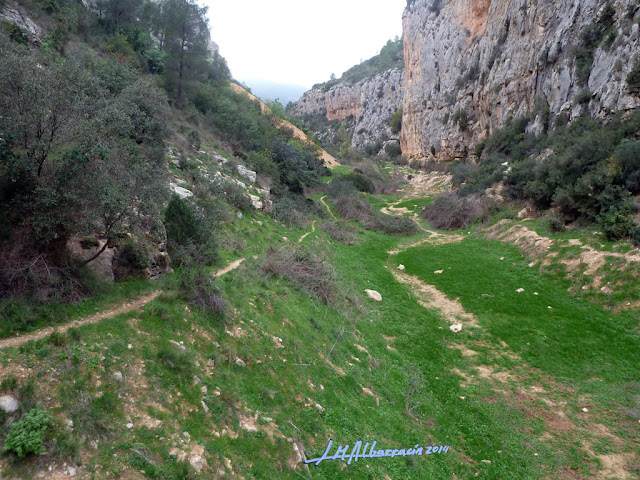 A partir de aquí continuamos siguiendo las indicaciones del PR siempre con el cañón a nuestra derecha hasta bajar al lecho del río para atravesarlo. En este tramo no llevaba agua.